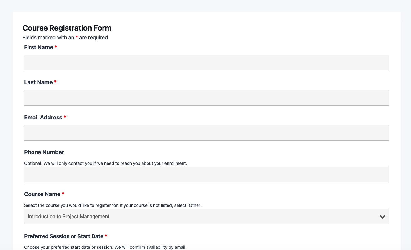 - Course selection dropdown – Lets registrants choose from your full course catalogue in a clean Select field.