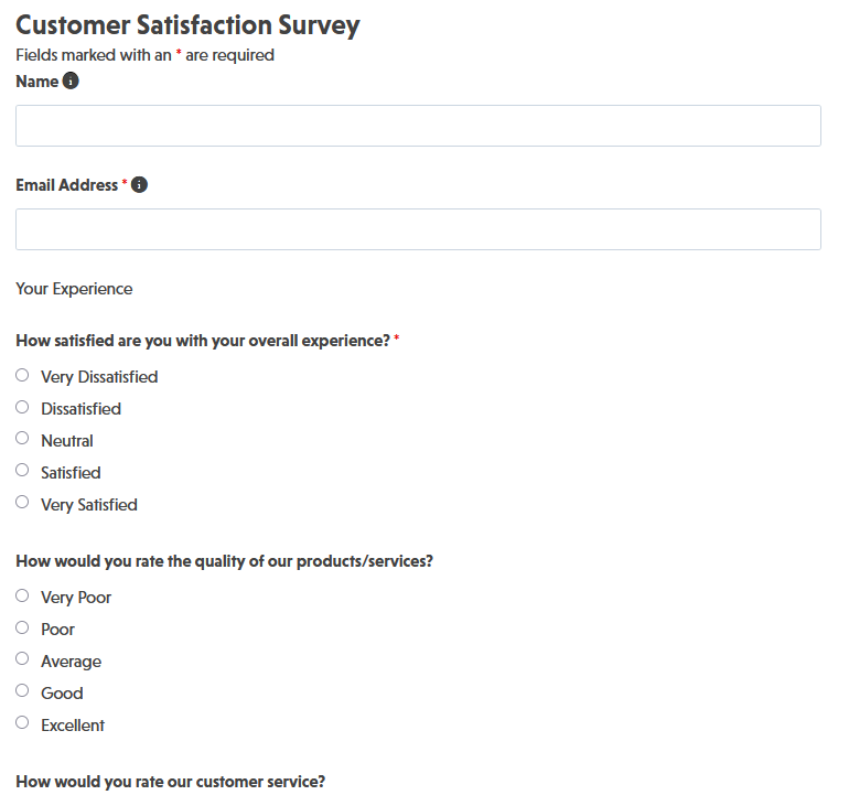 - Customer Service Rating (Radio List): Evaluates the customer’s experience with your support team or customer service interactions on a 5-point scale. Optional.