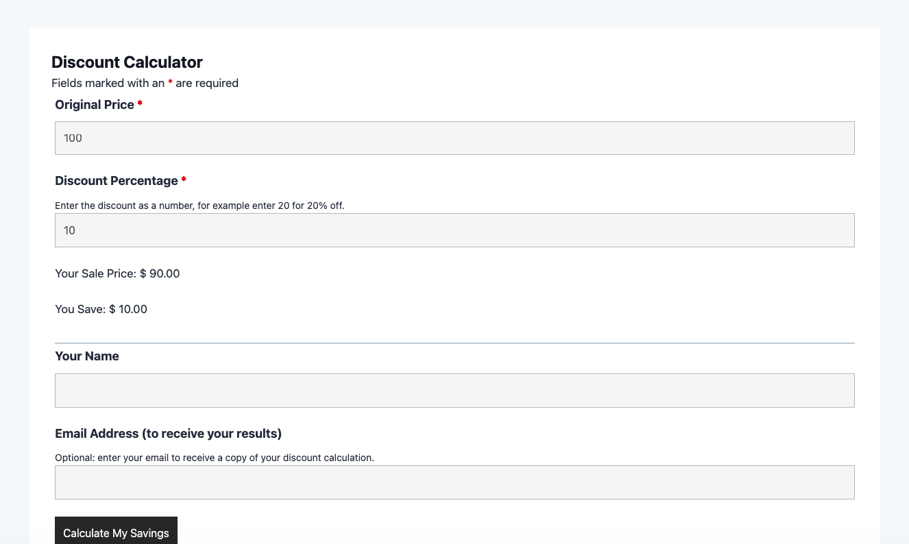 - Calculate My Savings (Submit): The submission button. Default label is “Calculate My Savings” – easily changed to “Get Discount,” “Show Sale Price,” or any label that fits your brand.
