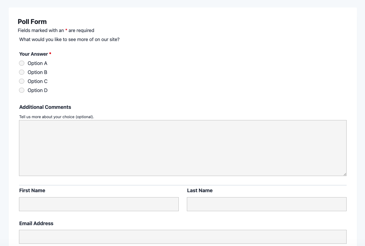 This poll form template is intentionally streamlined. It focuses on the core interaction – asking a question and capturing a clear answer – while giving respondents the option to share additional thoughts. The form is organized into two logical sections: the voting input and the respondent information fields. All together, the template includes 10 fields, keeping the experience fast and friction-free for your audience.